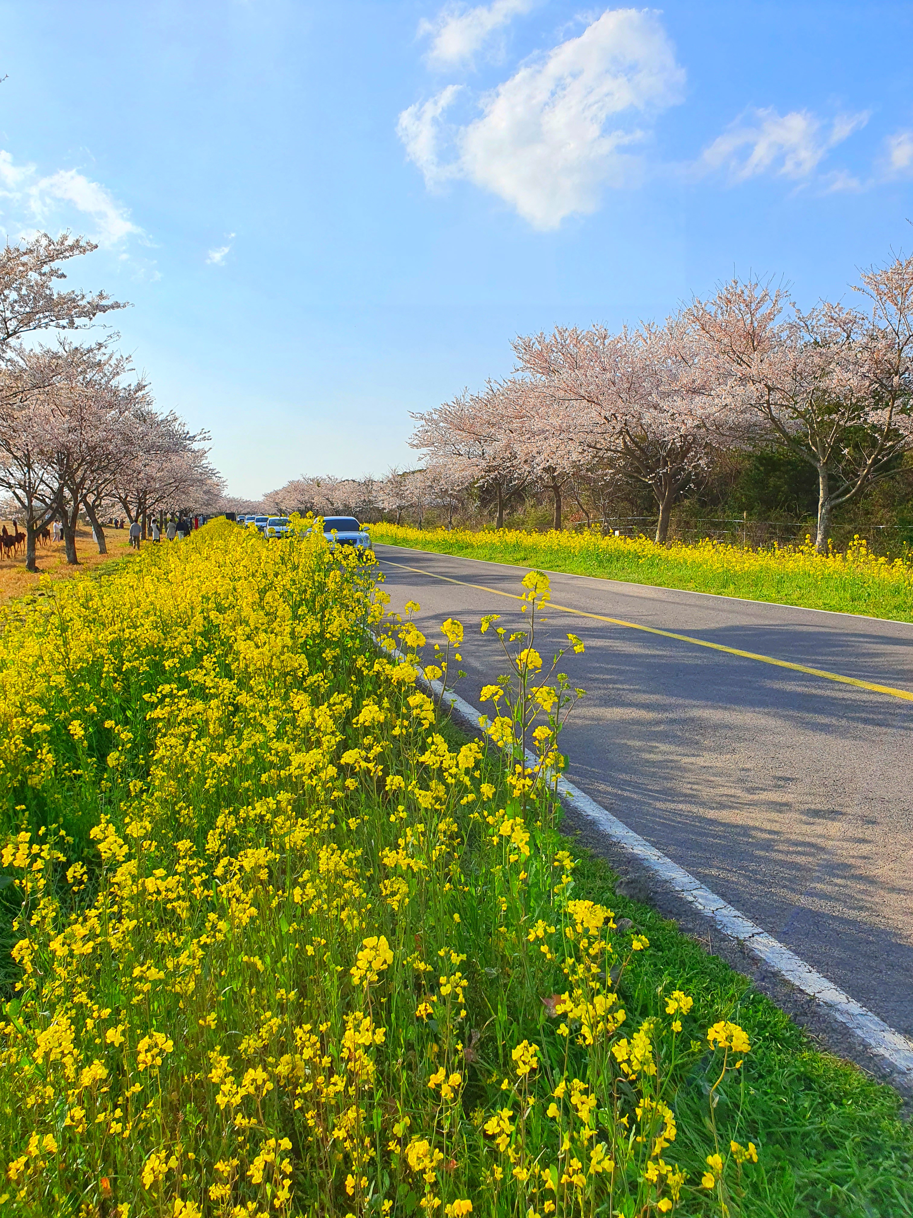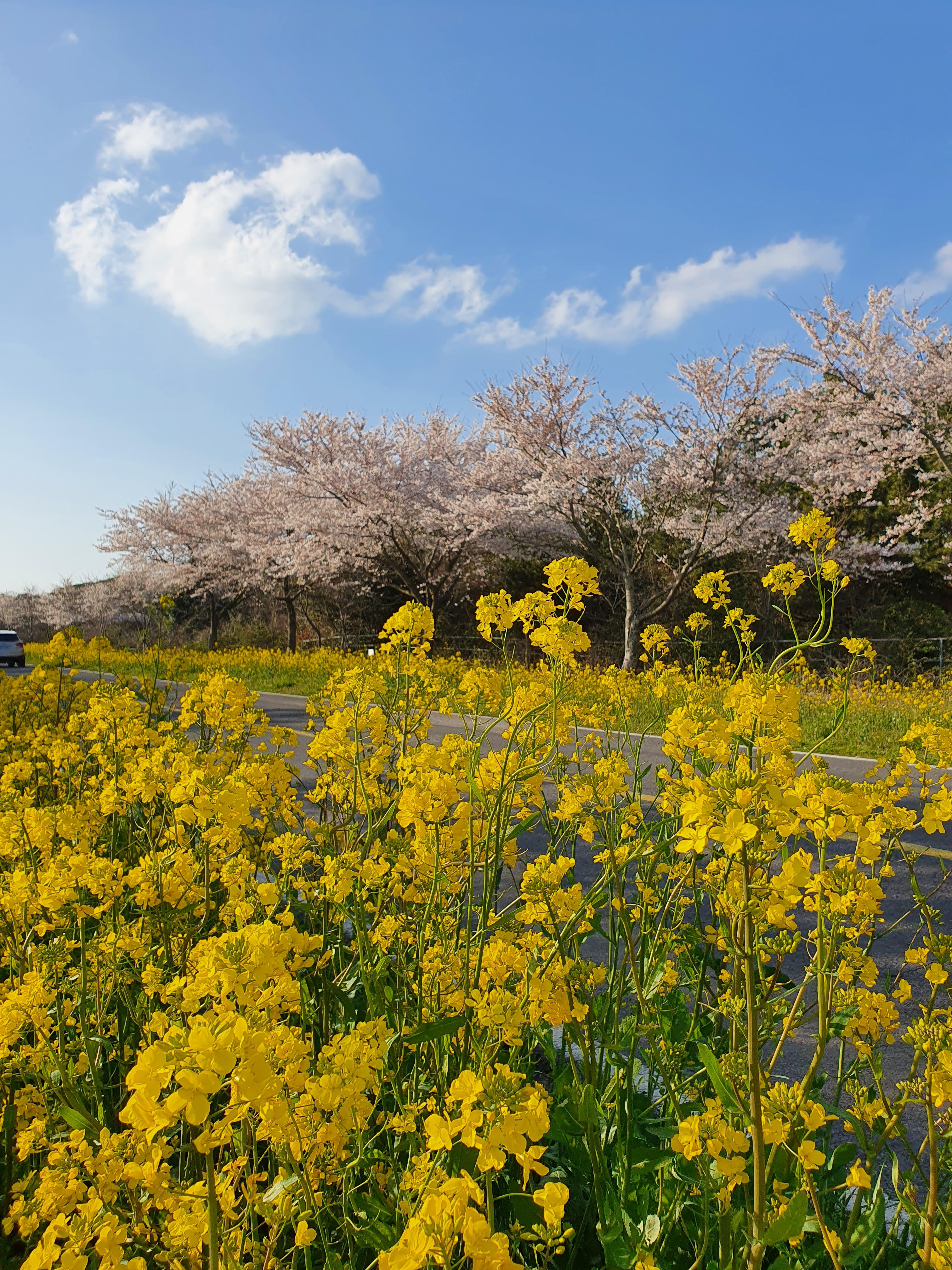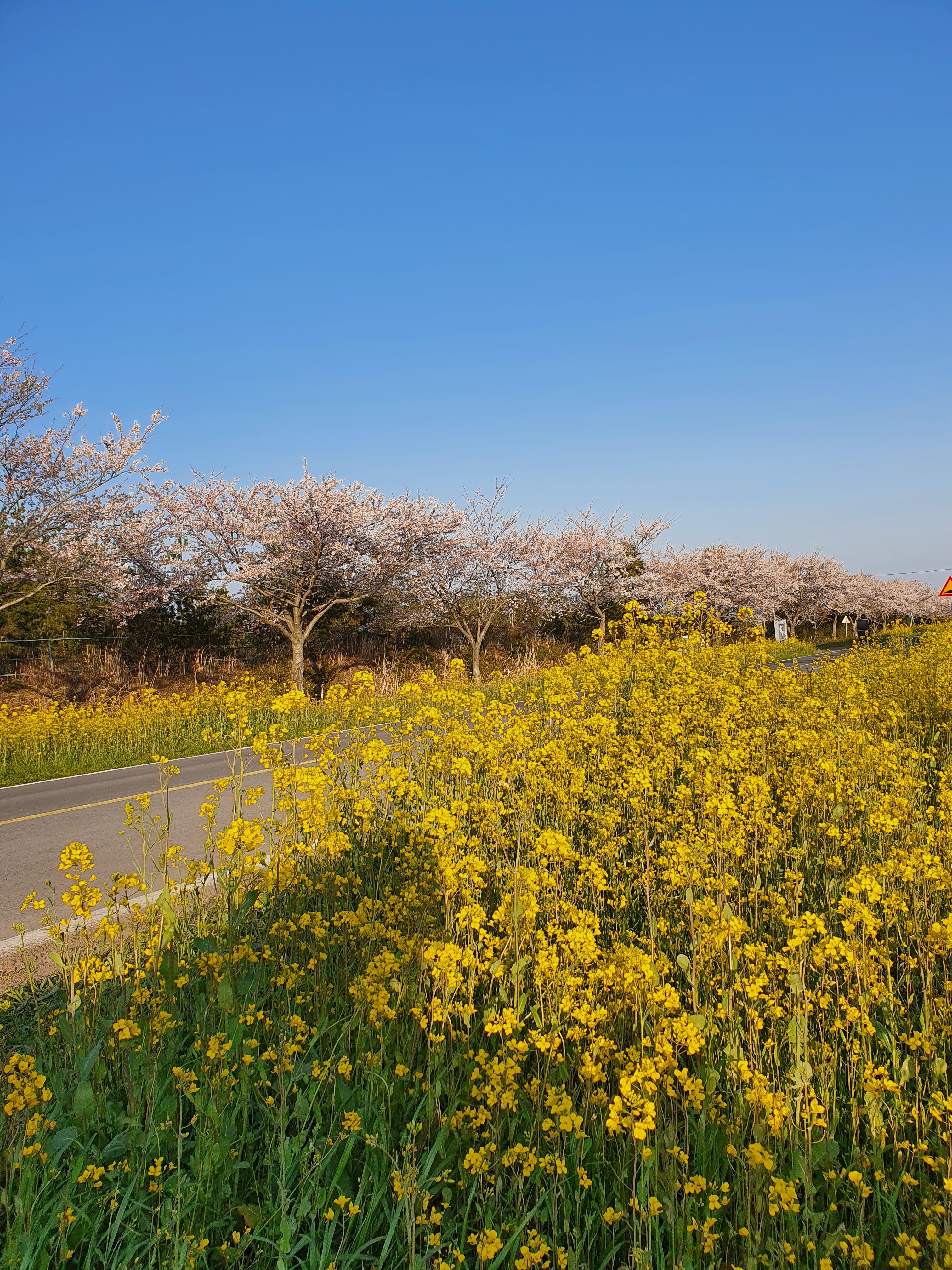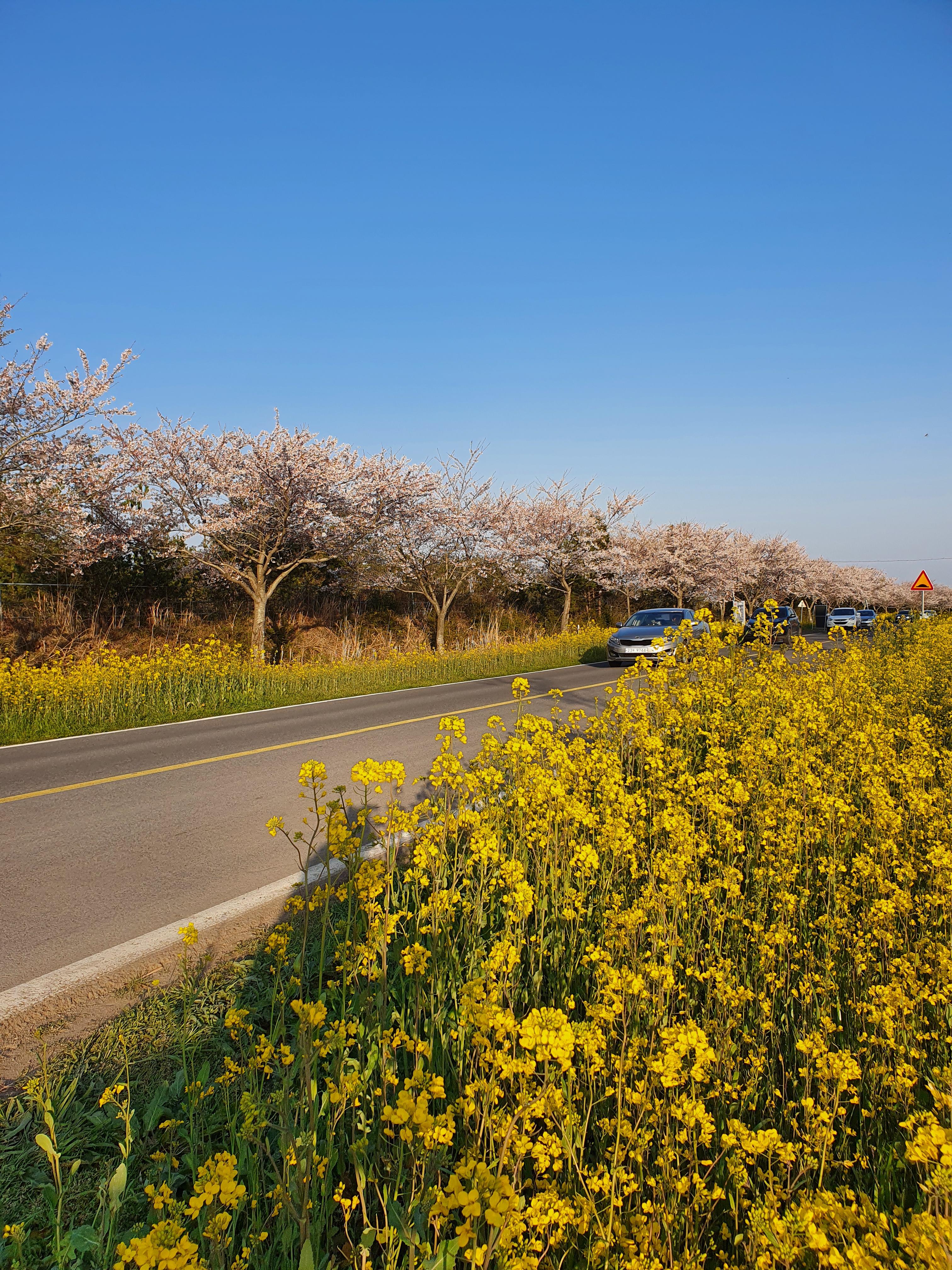 도로 양쪽으로 유채꽃과 벚꽃이 심어져있어서 세상에서 이렇게 예쁜 드라이브길은