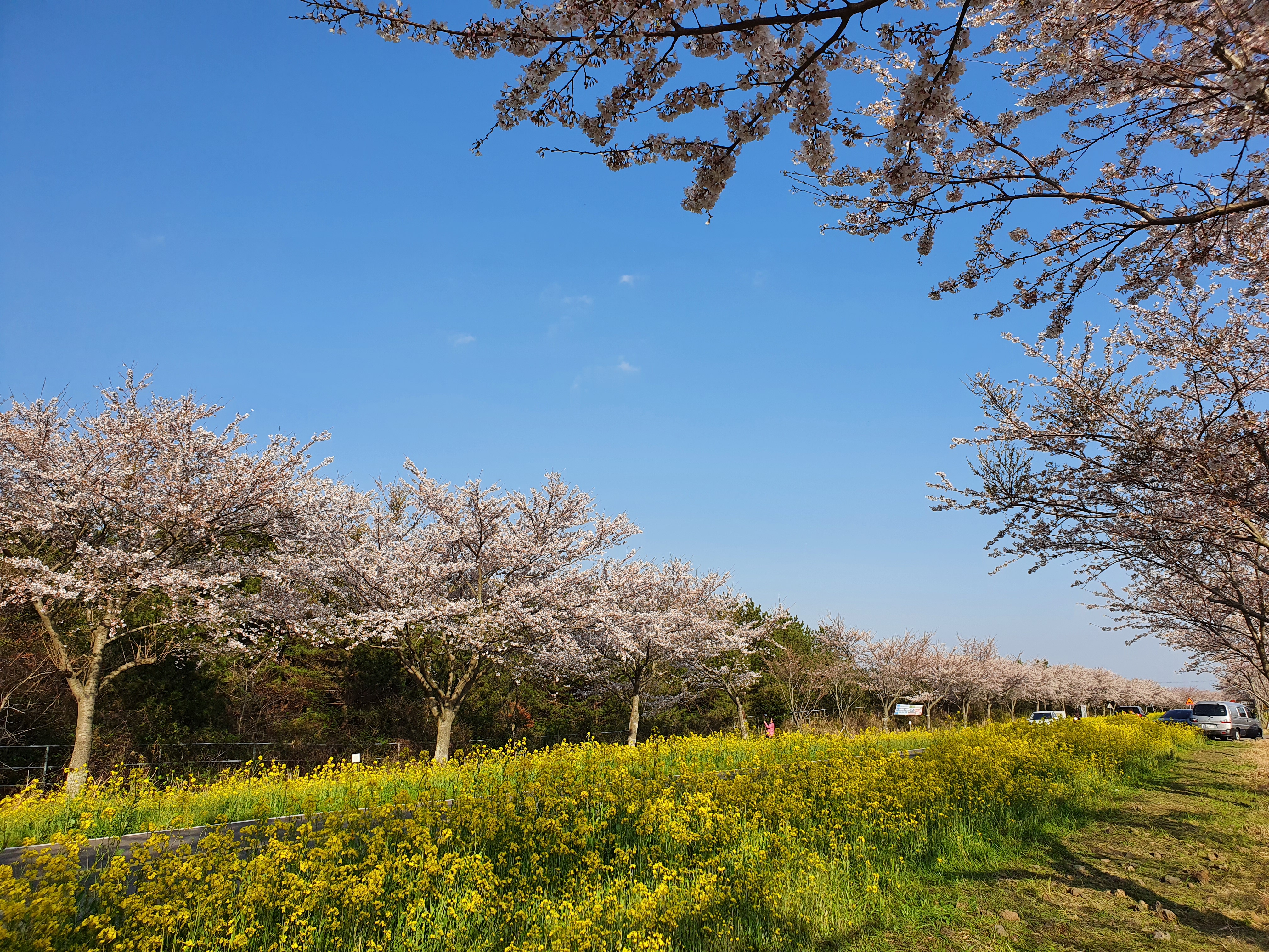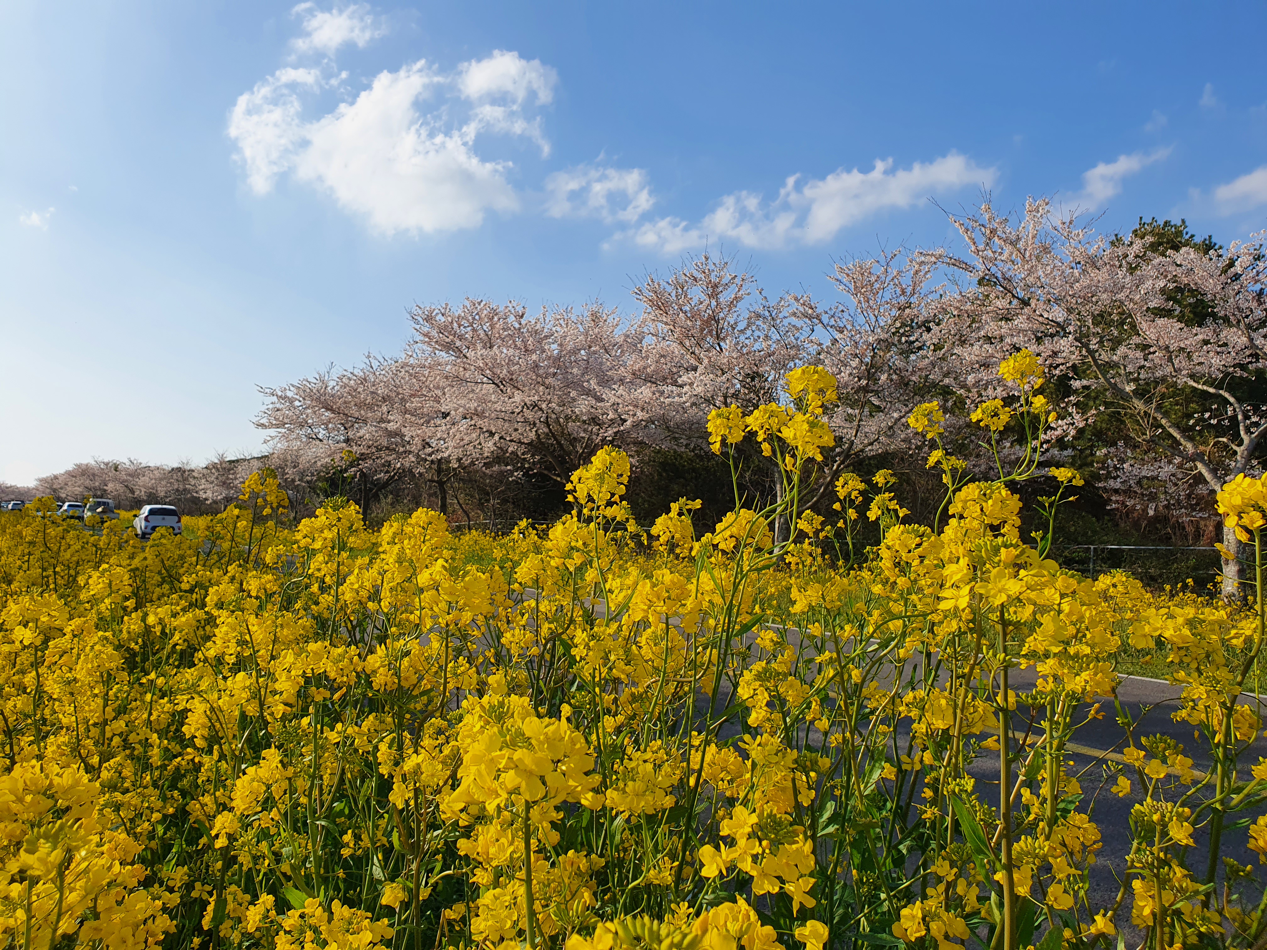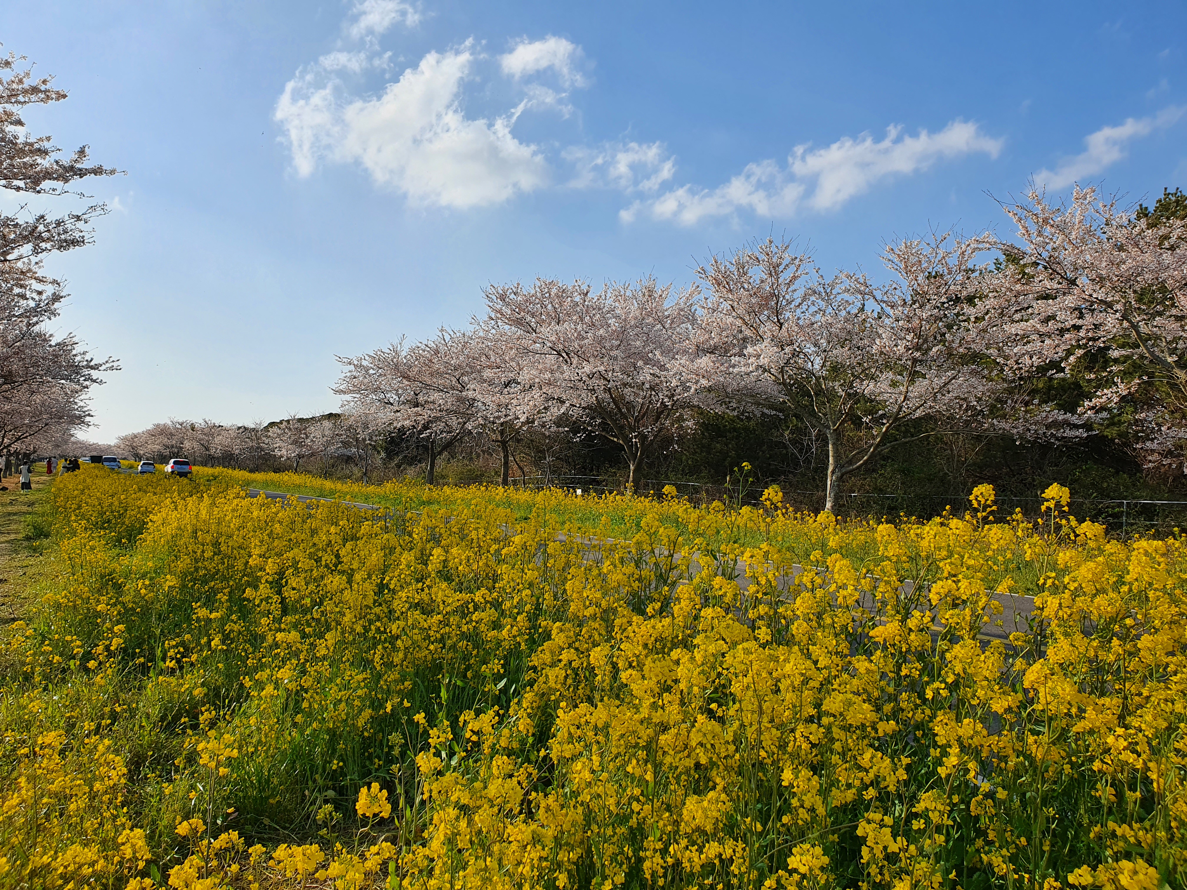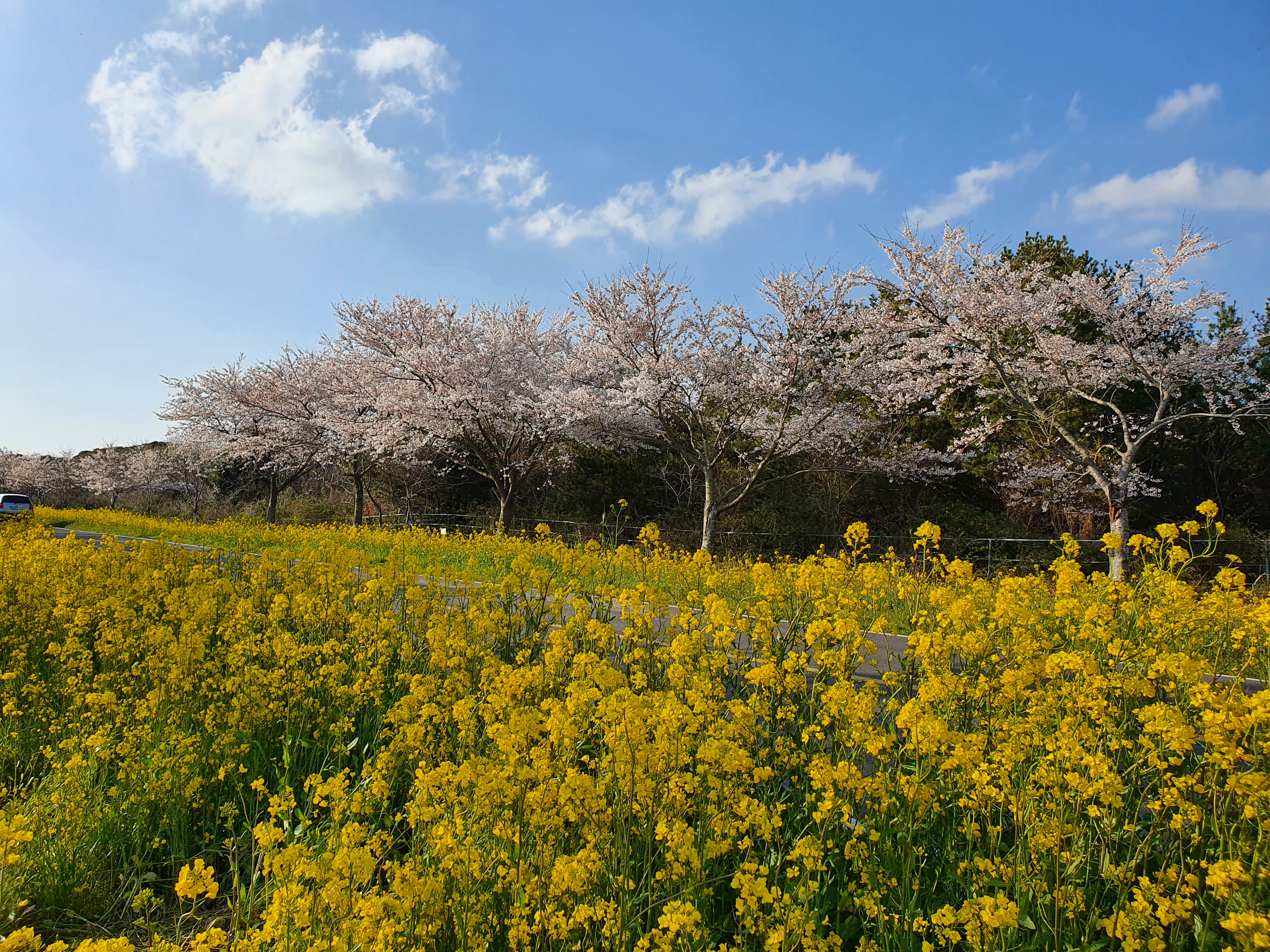 도로 양쪽으로 유채꽃과 벚꽃이 심어져있어서 세상에서 이렇게 예쁜 드라이브길은