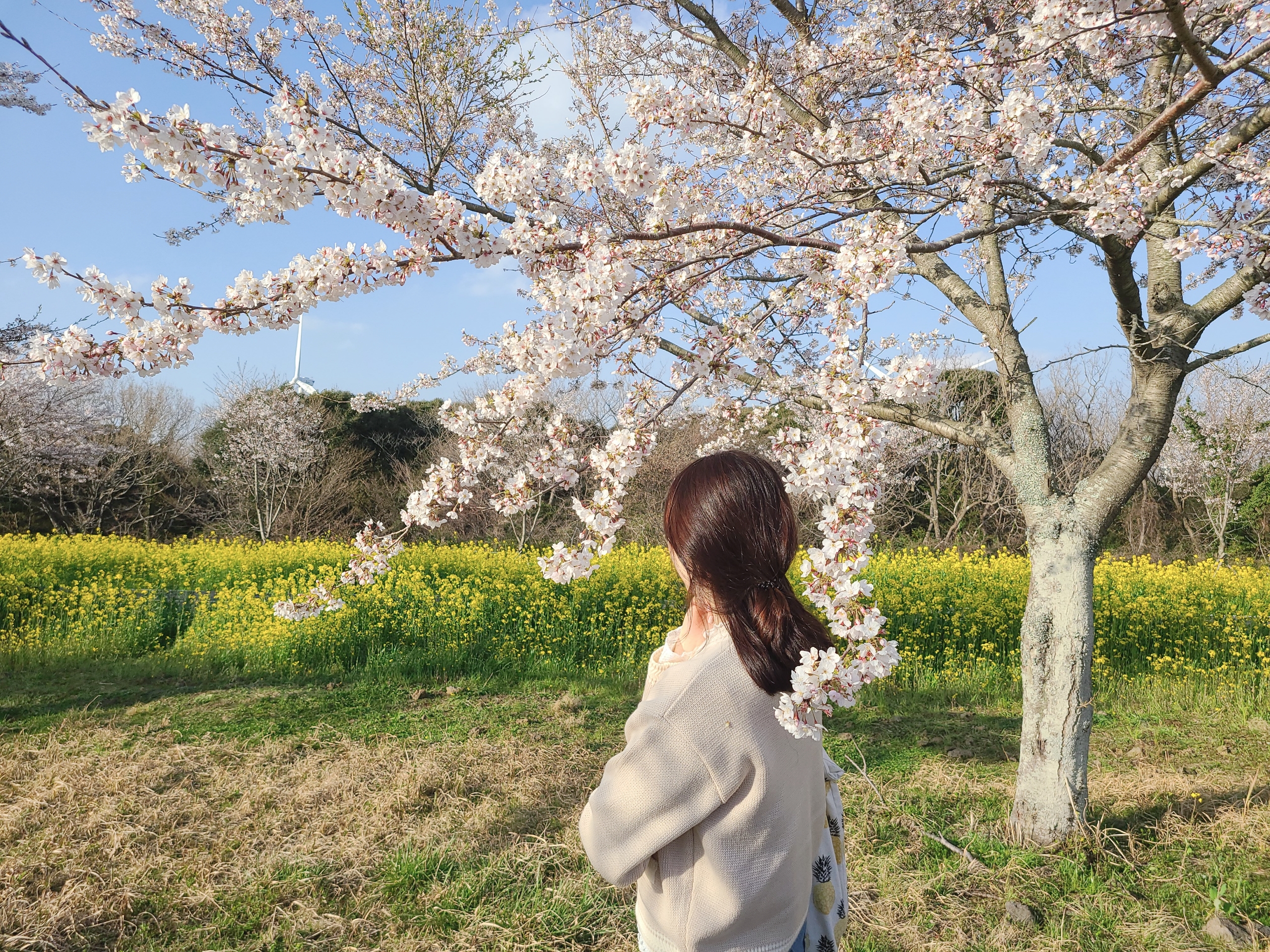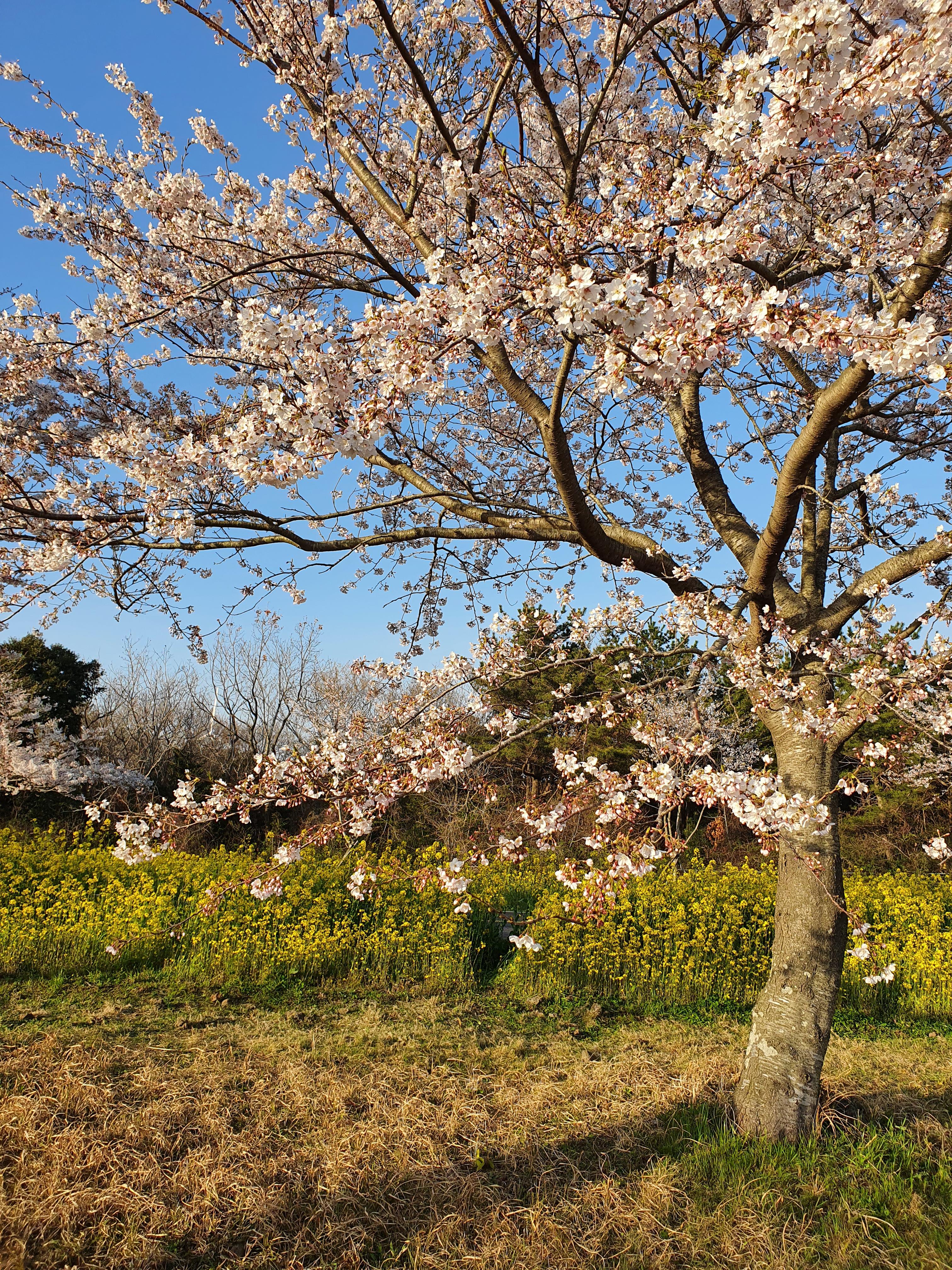 파란 하늘과 벚꽃, 유채꽃의 아름다운 조화