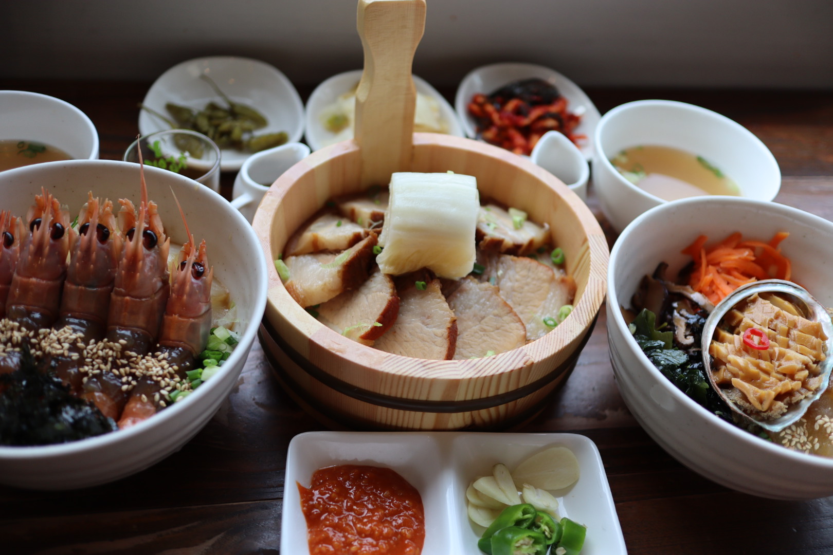 메뉴들이 전부 나왔어요. 딱새우장비빔밥, 돔베고기, 그리고 통전복 비빔밥 이렇게요. ^^