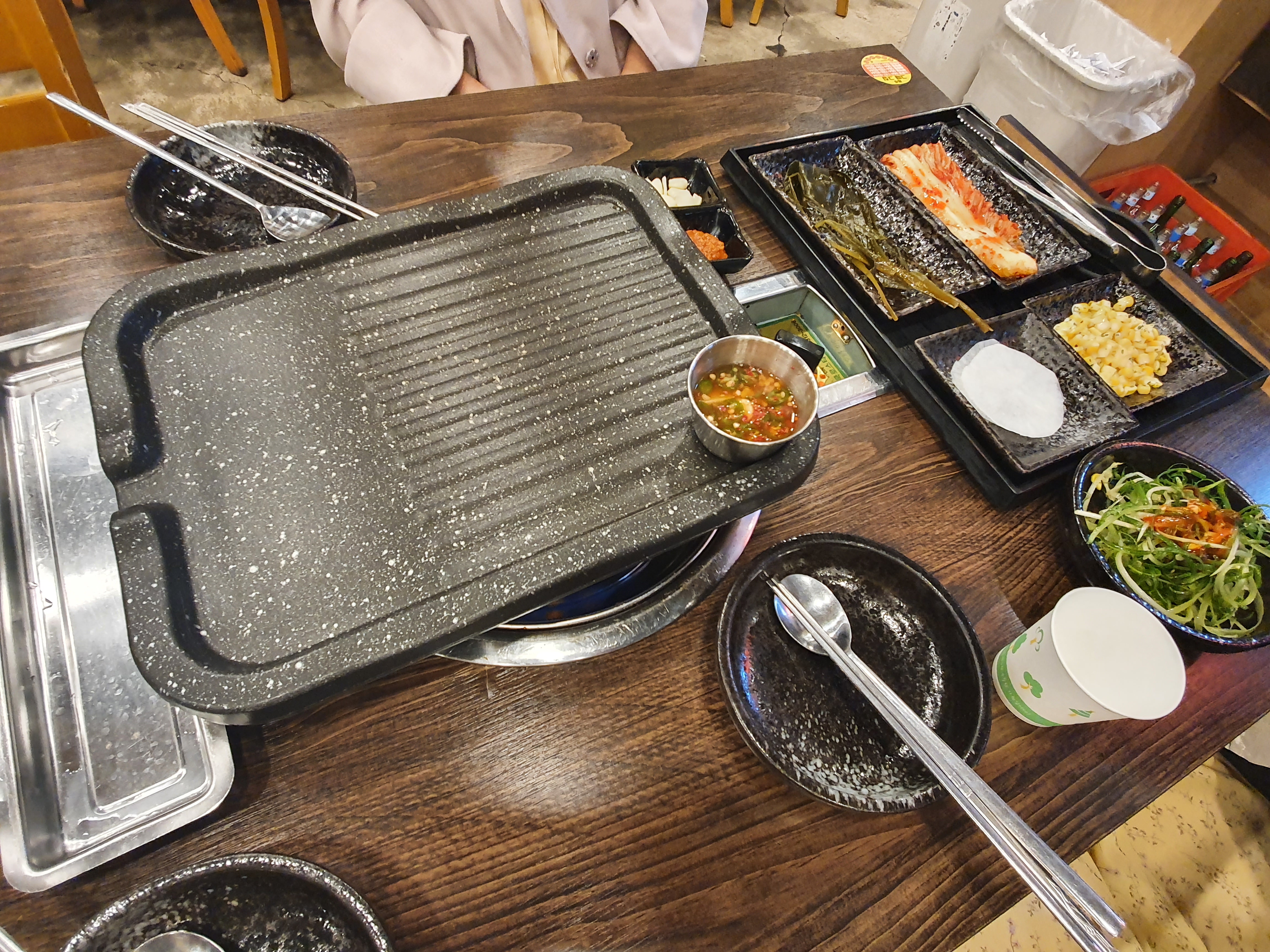 뭔가 역할분담이 잘 된 느낌이었고 기본 반찬들 (파절이, 쌈무, 스위트콘, 명이나물, 김치)이 세팅되었습니다.