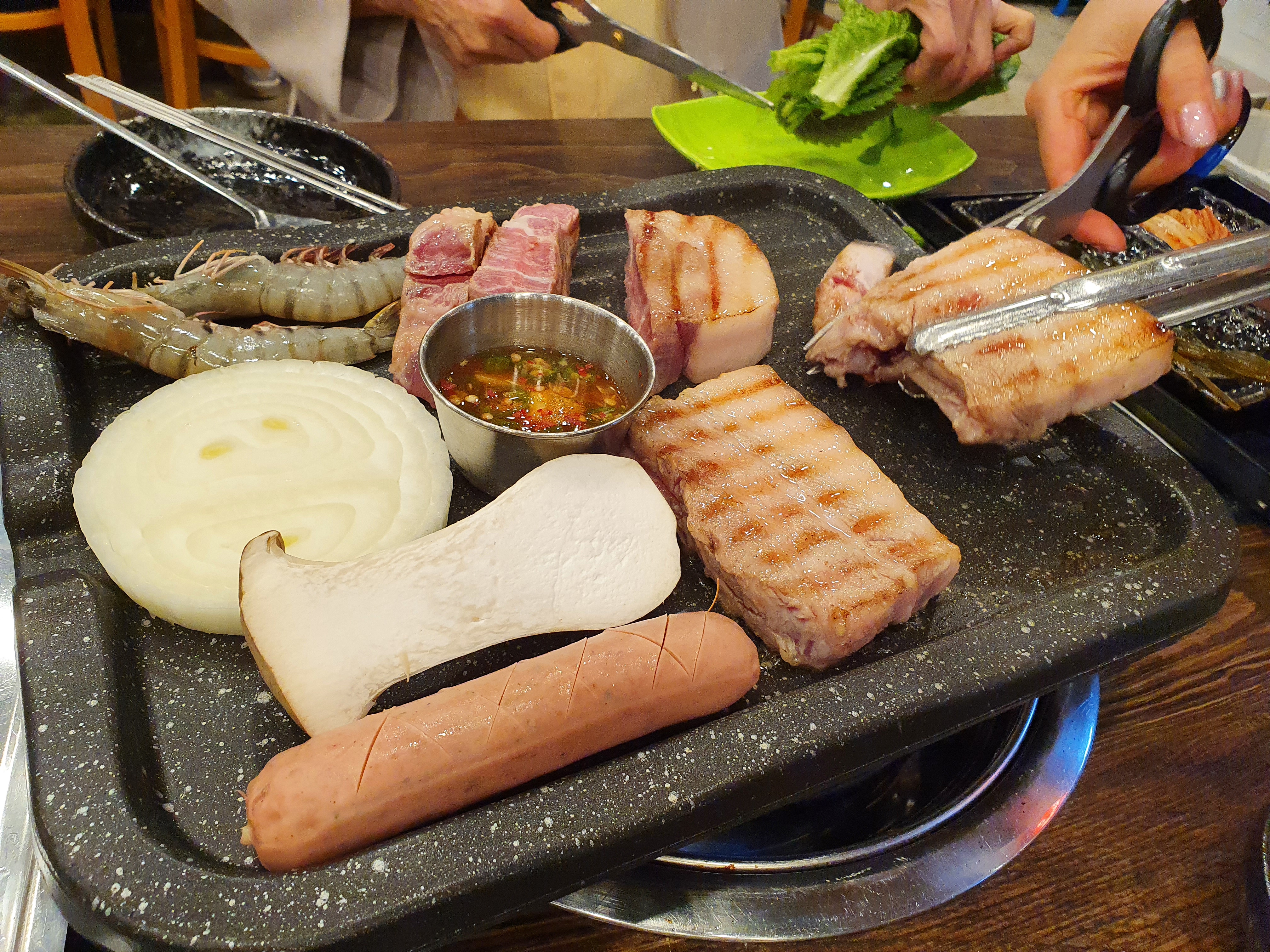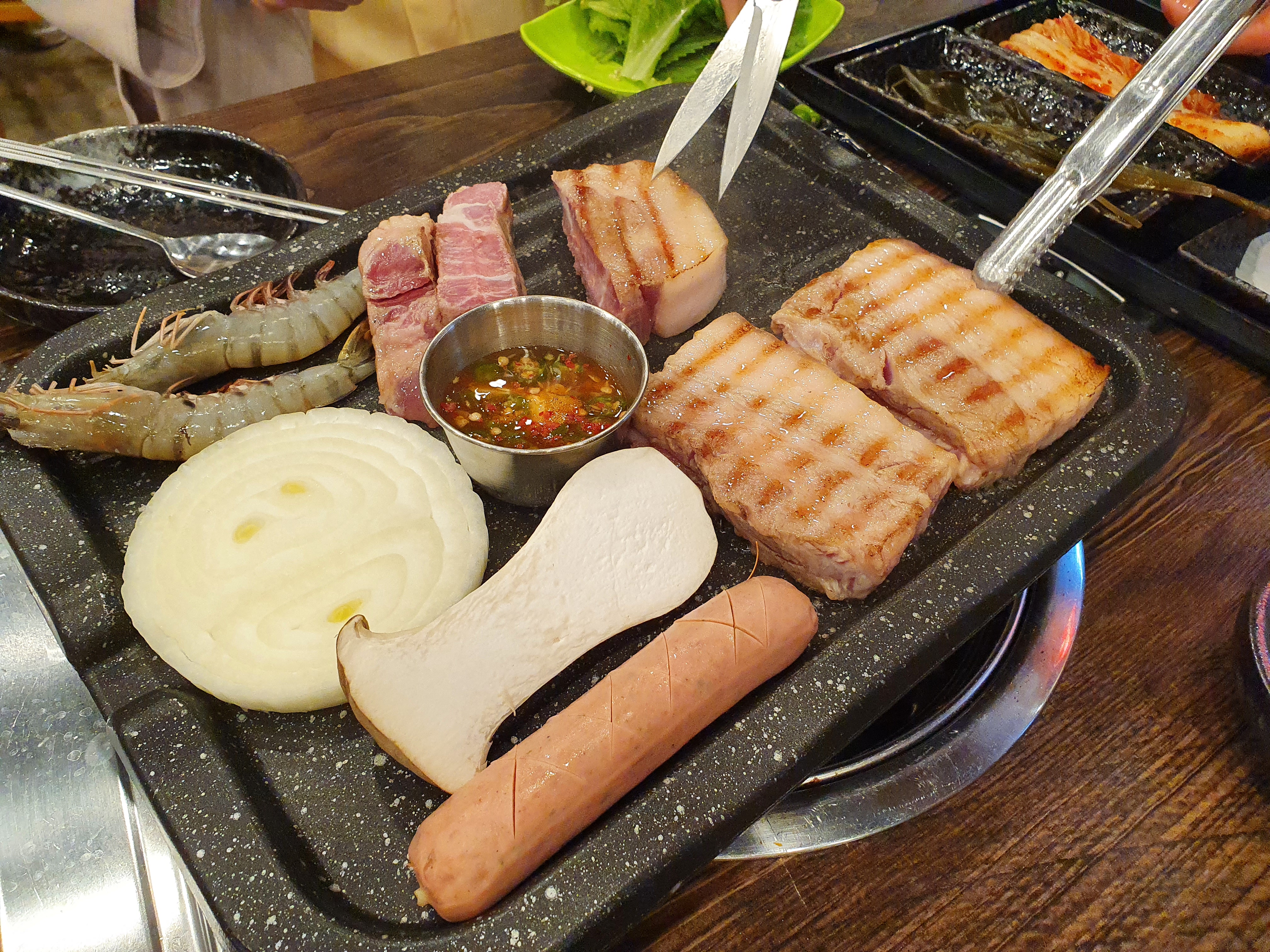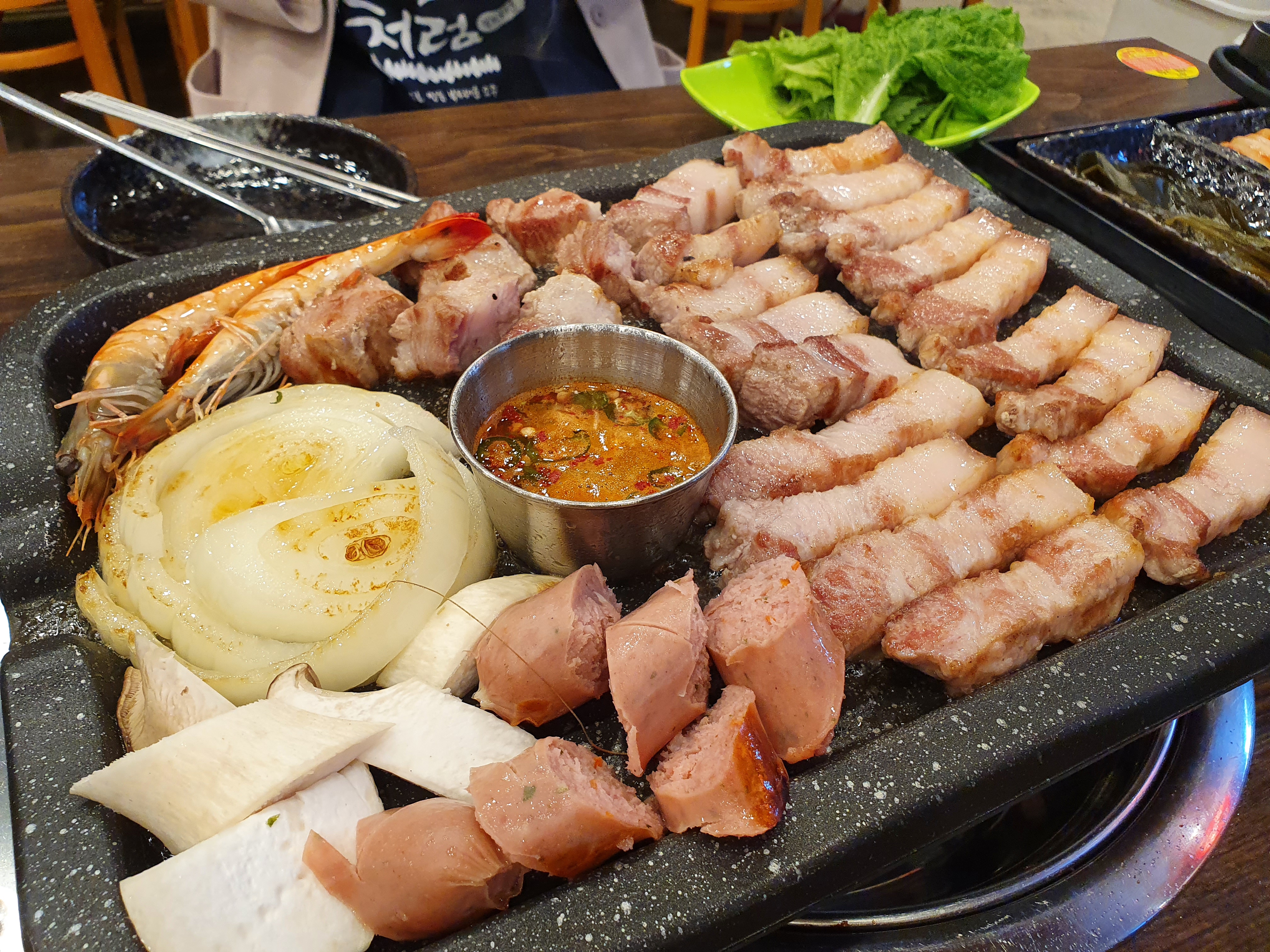 고기 불판 위에 오겹살과 목살, 멜젓, 소세지, 버섯, 양판, 새우 등을 바로 올려주시고