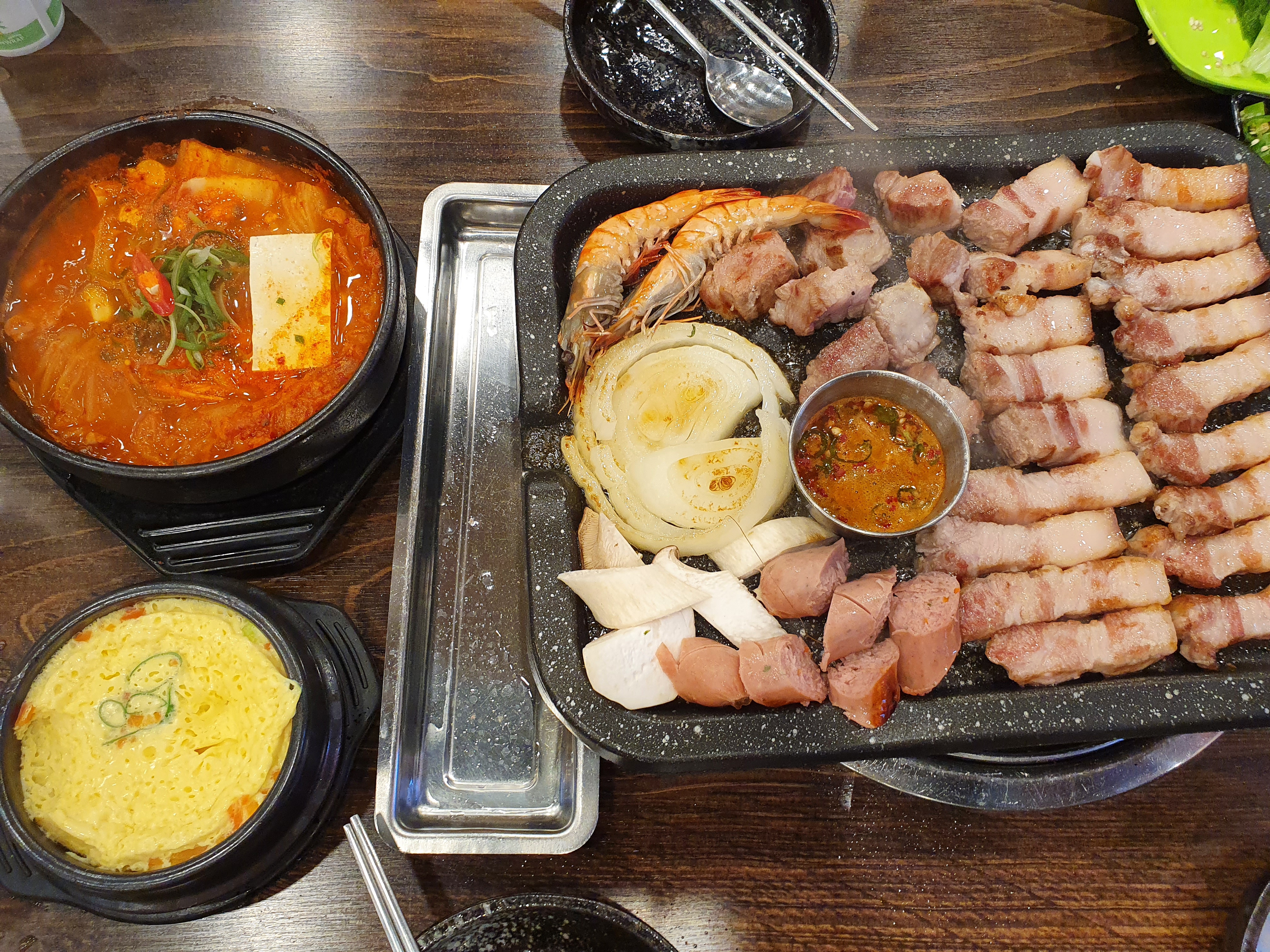 그런데 여기는 세트로 하면 600g을 받고 흑돼지 김치찌개와 계란찜, 소시지와 왕새우가 서비스로 함께 나온답니다.