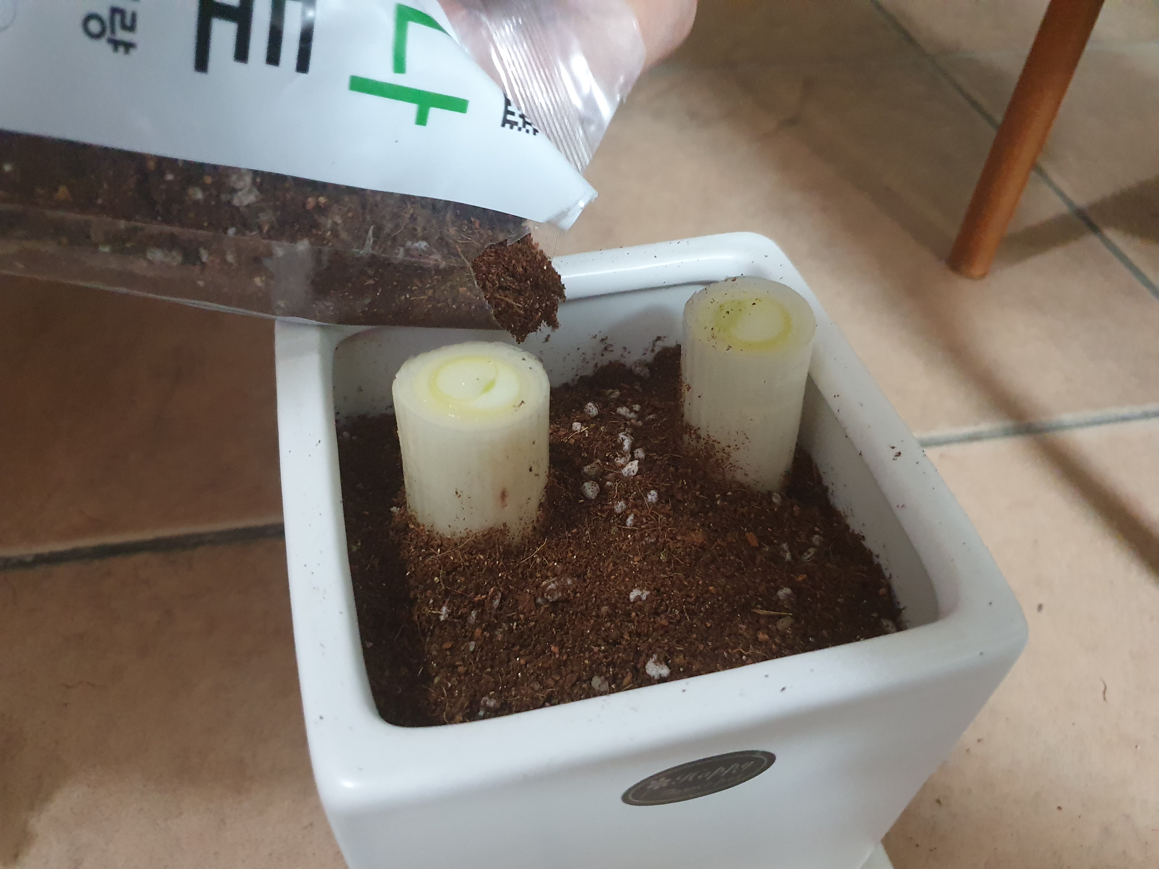 원예용 상토를 적당히 채운 뒤에 파를 심었어요.