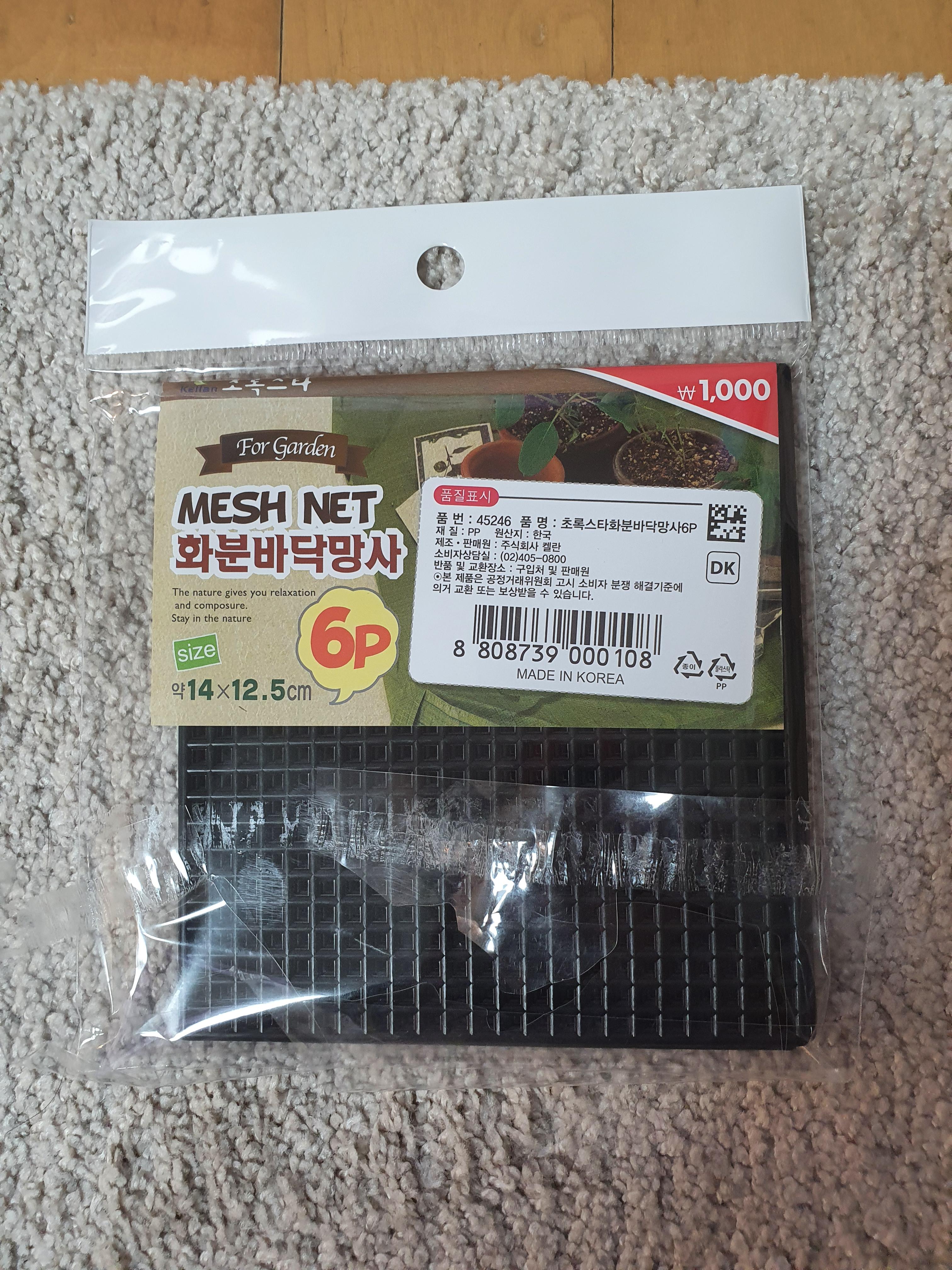 6p짜리 화분 바닥 망사를 사서 물이 잘 흘러 빠질 수 있도록 했고