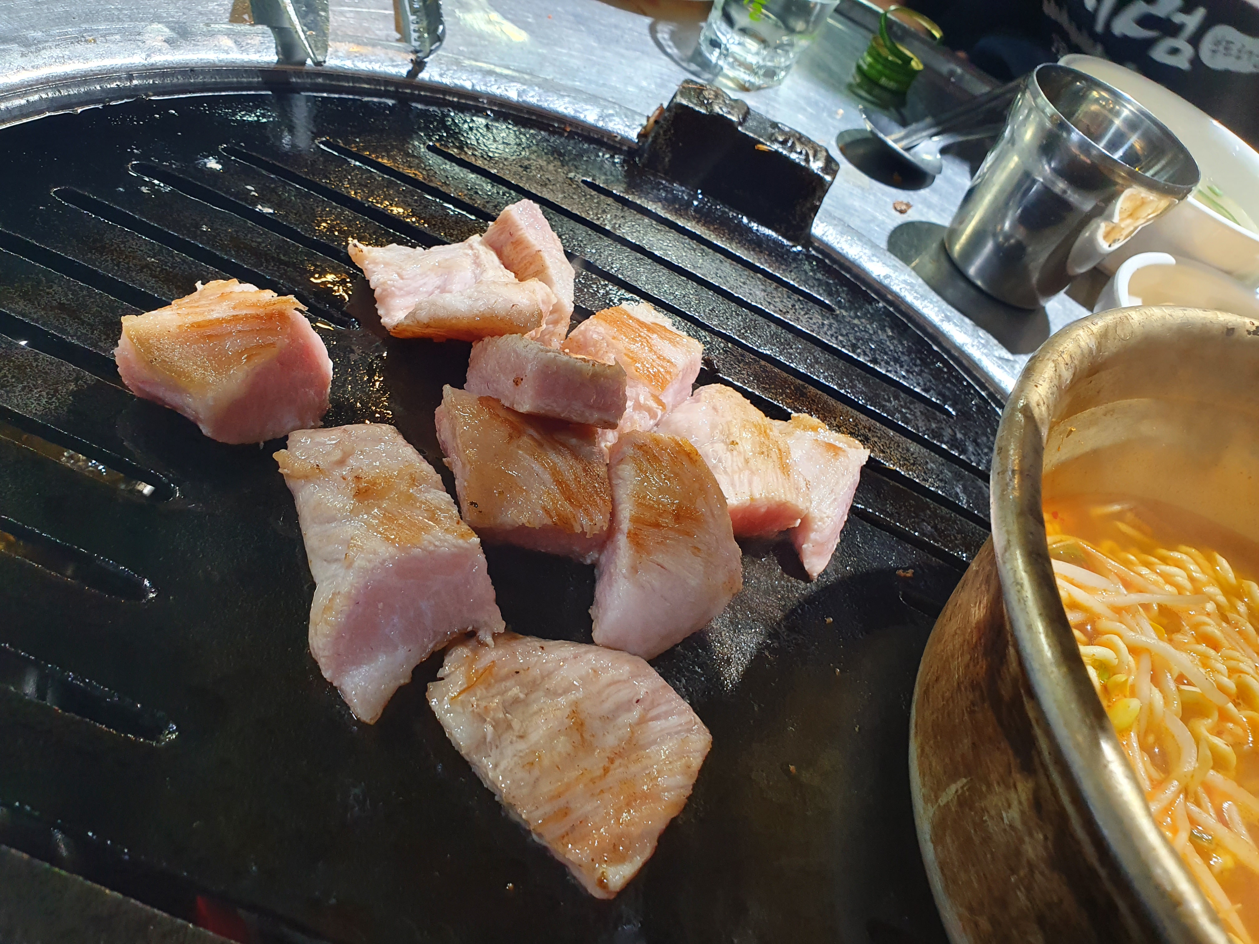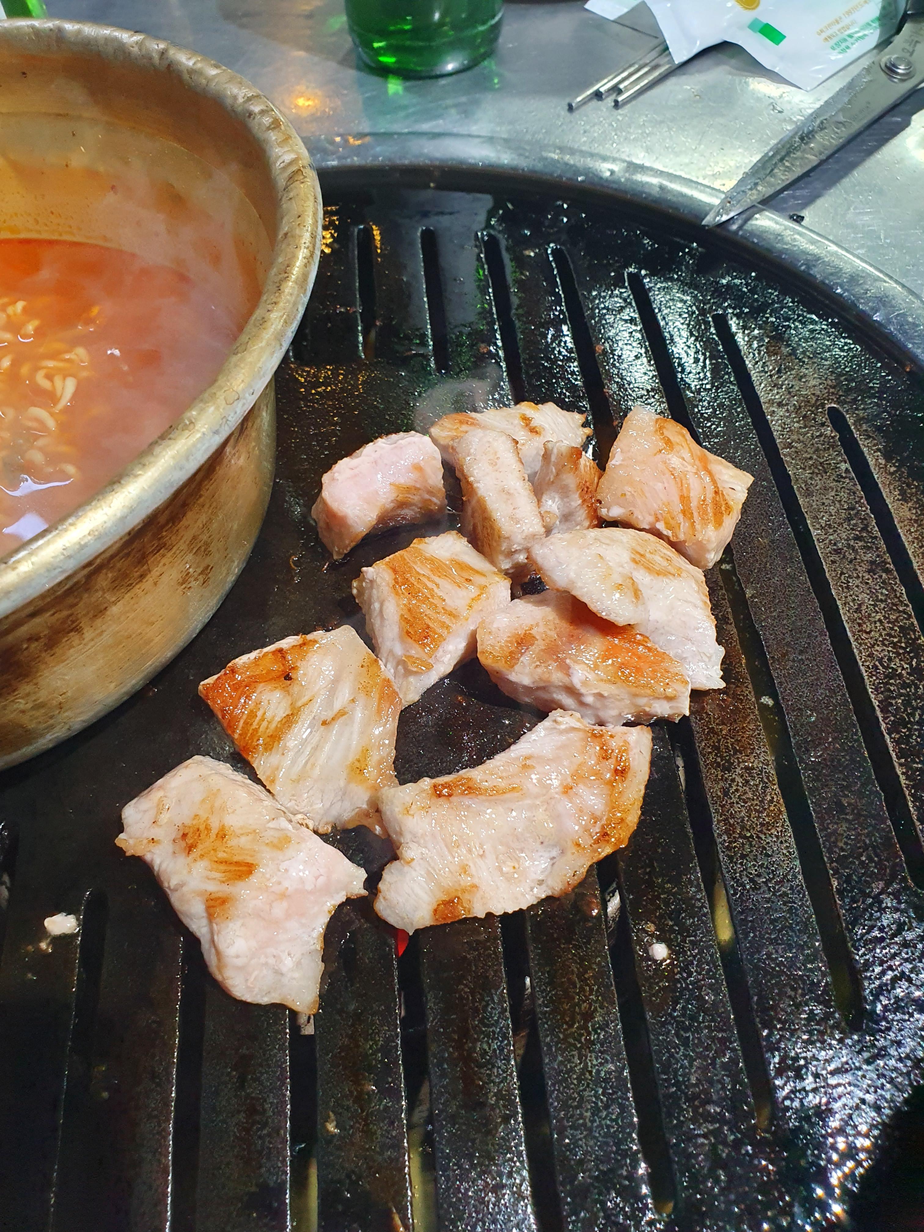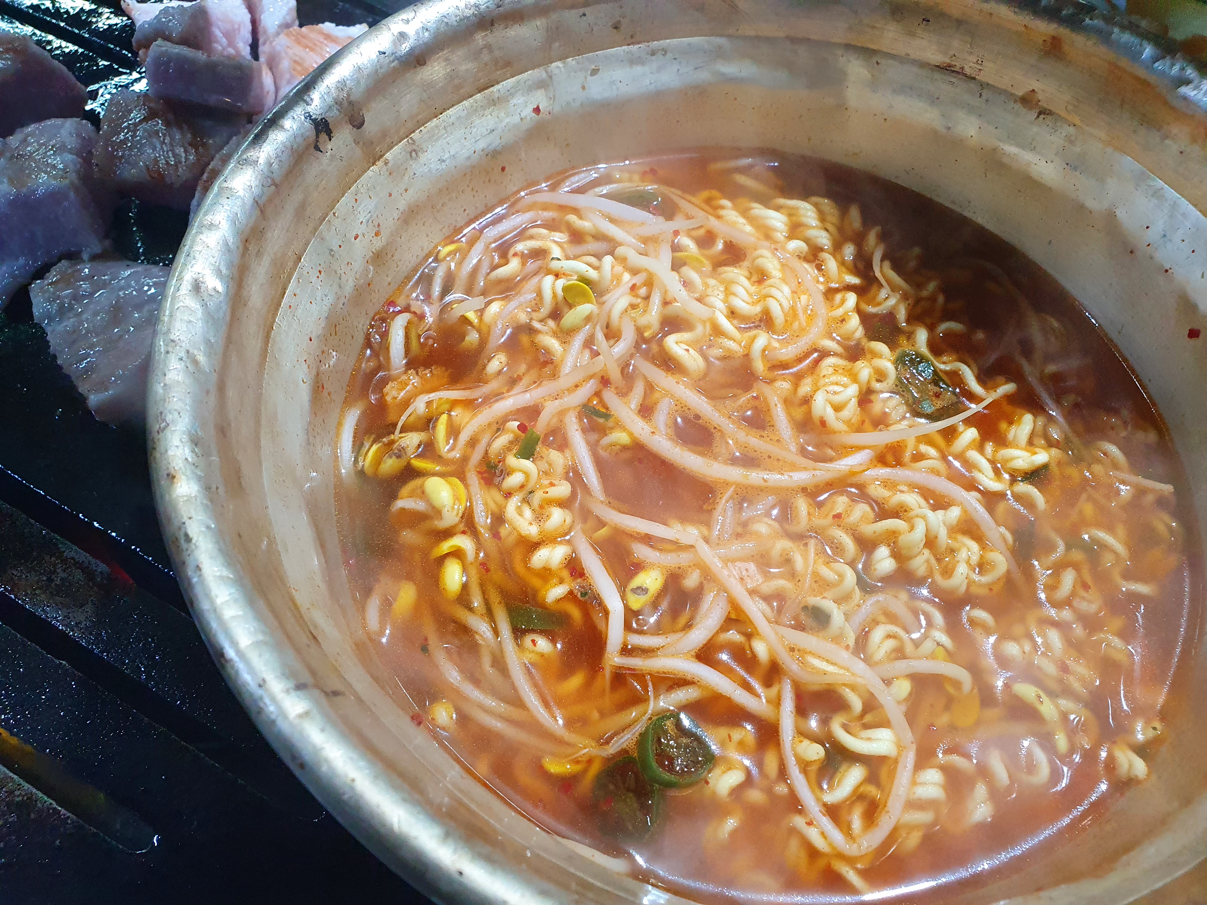 옆에 있는 콩나물 라면과 함께 항정살을 먹으니 찰떡궁합이었어요.