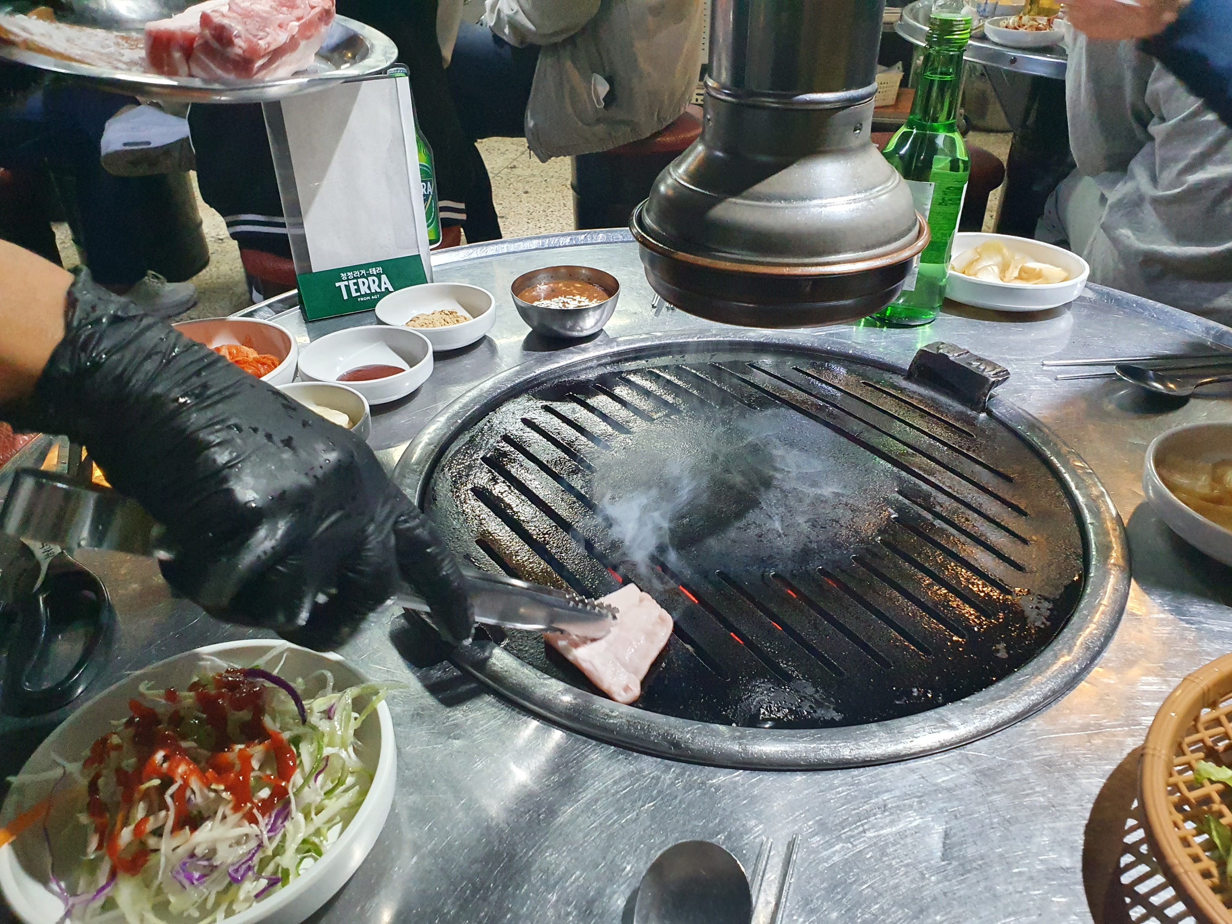 이모님께서 밑반찬들을 내주시고 바로 고기를 올려주세요.
