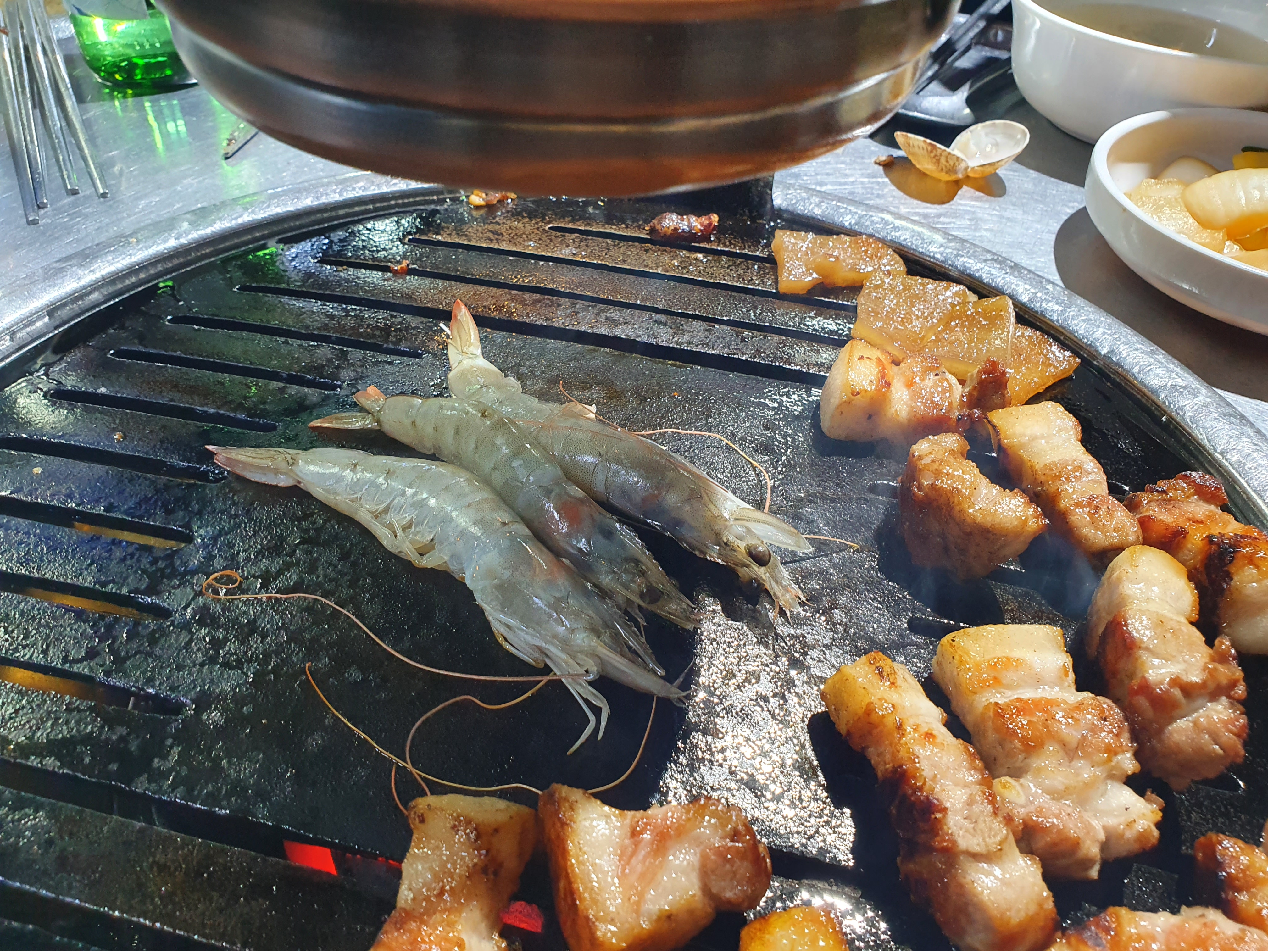 삼겹살을 맛있게 먹고 있는데 사장님께서 새우가 담긴 통을 들고 다니시면서