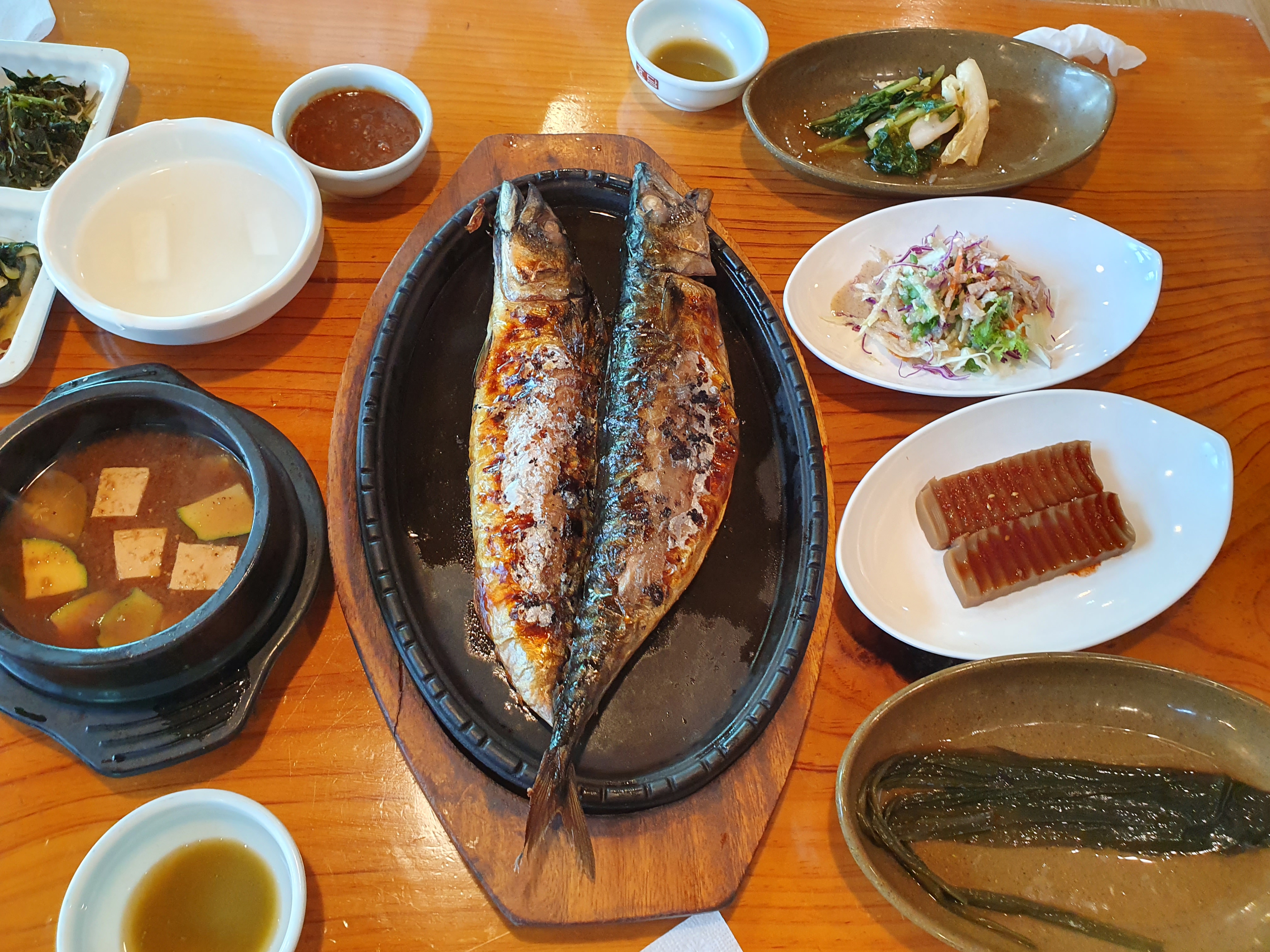 그리고 나온 집된장찌개와 고등어구이, 명이나물, 도토리묵, 샐러드, 열무김치, 동치미 등등