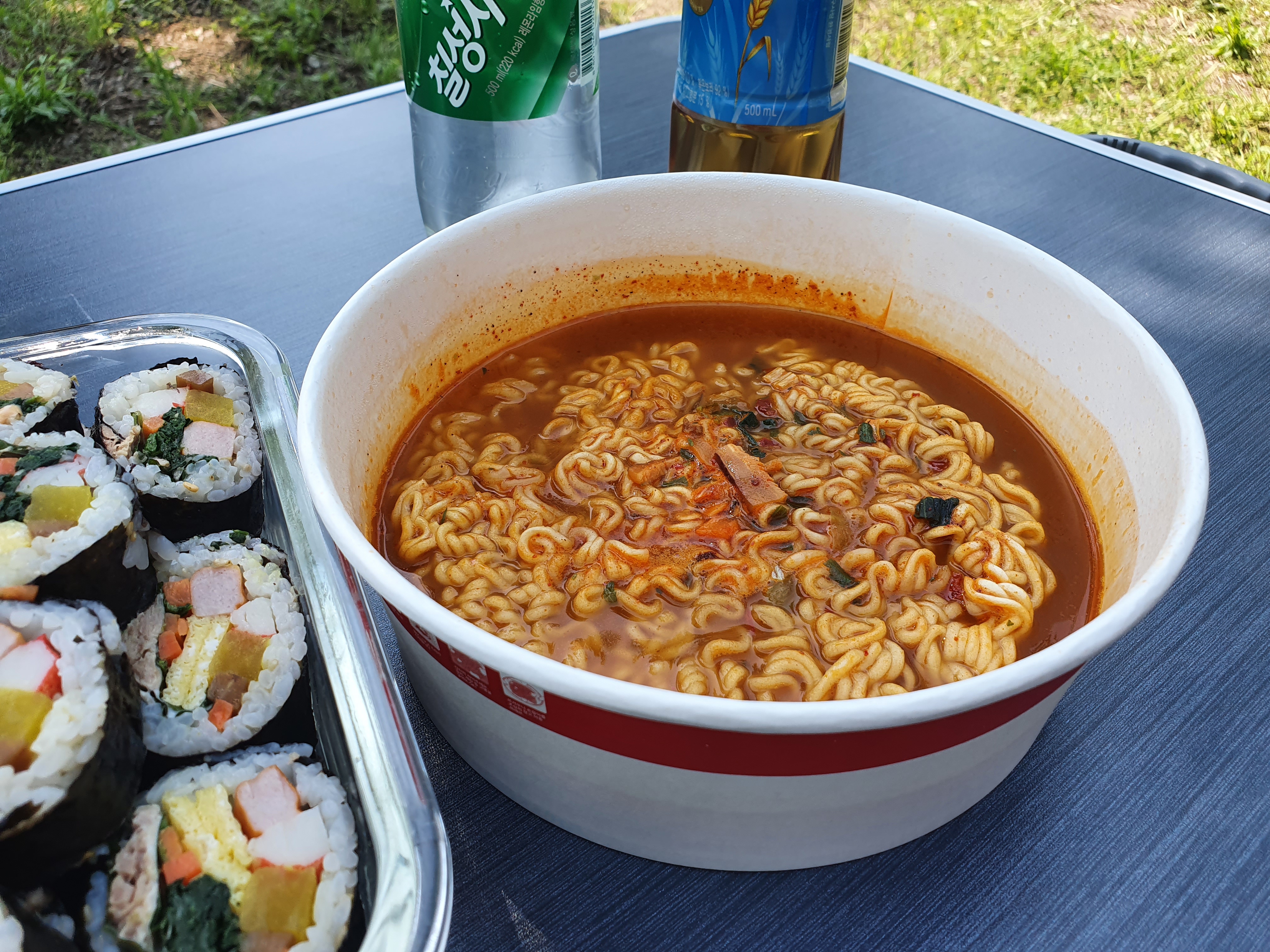 라면도 매콤하고 라면이랑 김밥이 완전 찰떡궁합! 김밥 한 입에 라면 한 입 먹으니