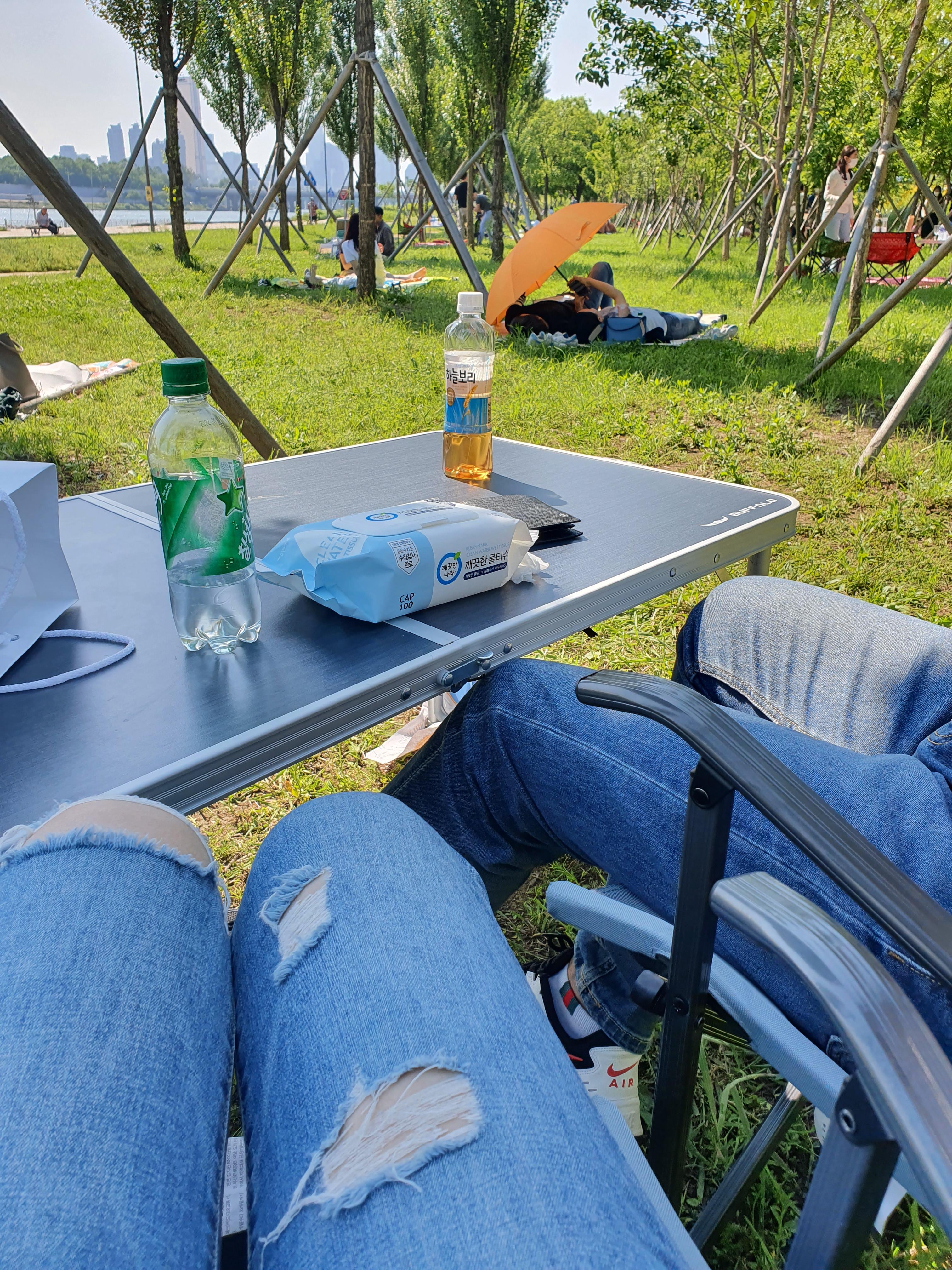 한강이 보이는 뷰에 앉아 캠핑 의자, 테이블을 이용하니 너무 편하고 뭐든 올려놓을 수 있으니 좋았답니다.