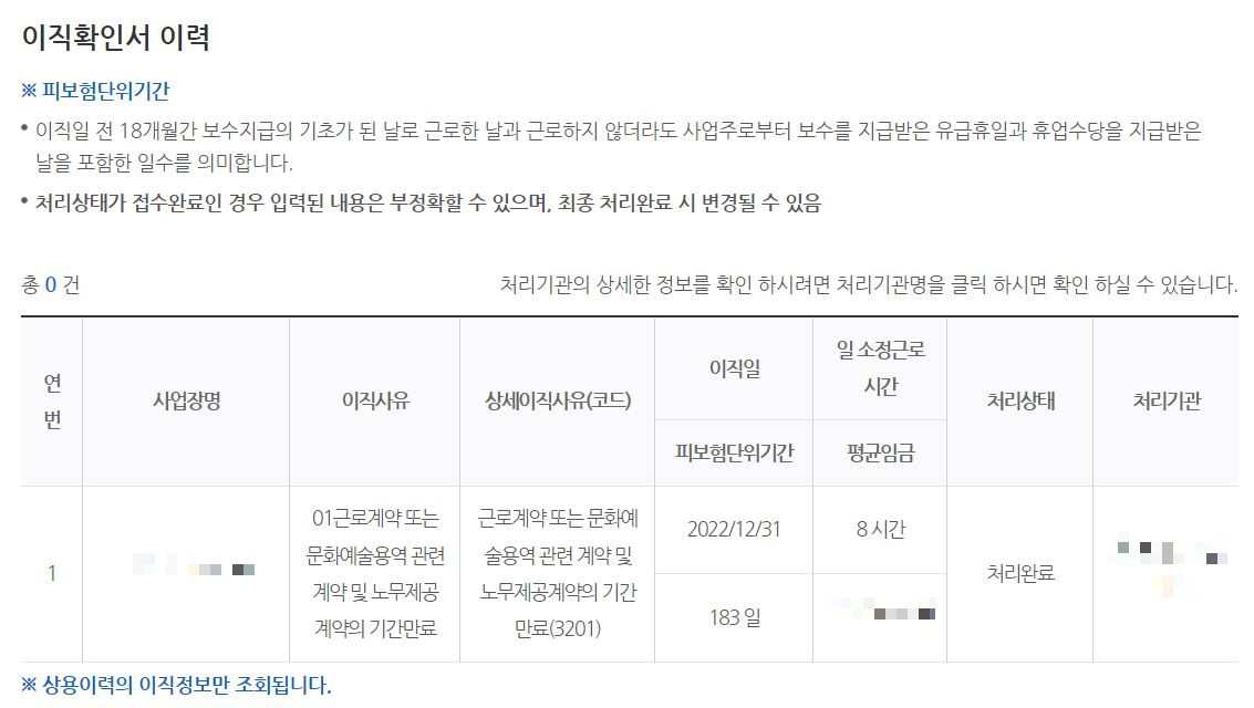 또한, 이직 확인서의 처리상태의 경우 접수완료와 처리완료가 있는데, 처리 완료가 되어야 본인이 받을 수 있는 기간, 총 금액 등을 확인하실 수 있답니다.