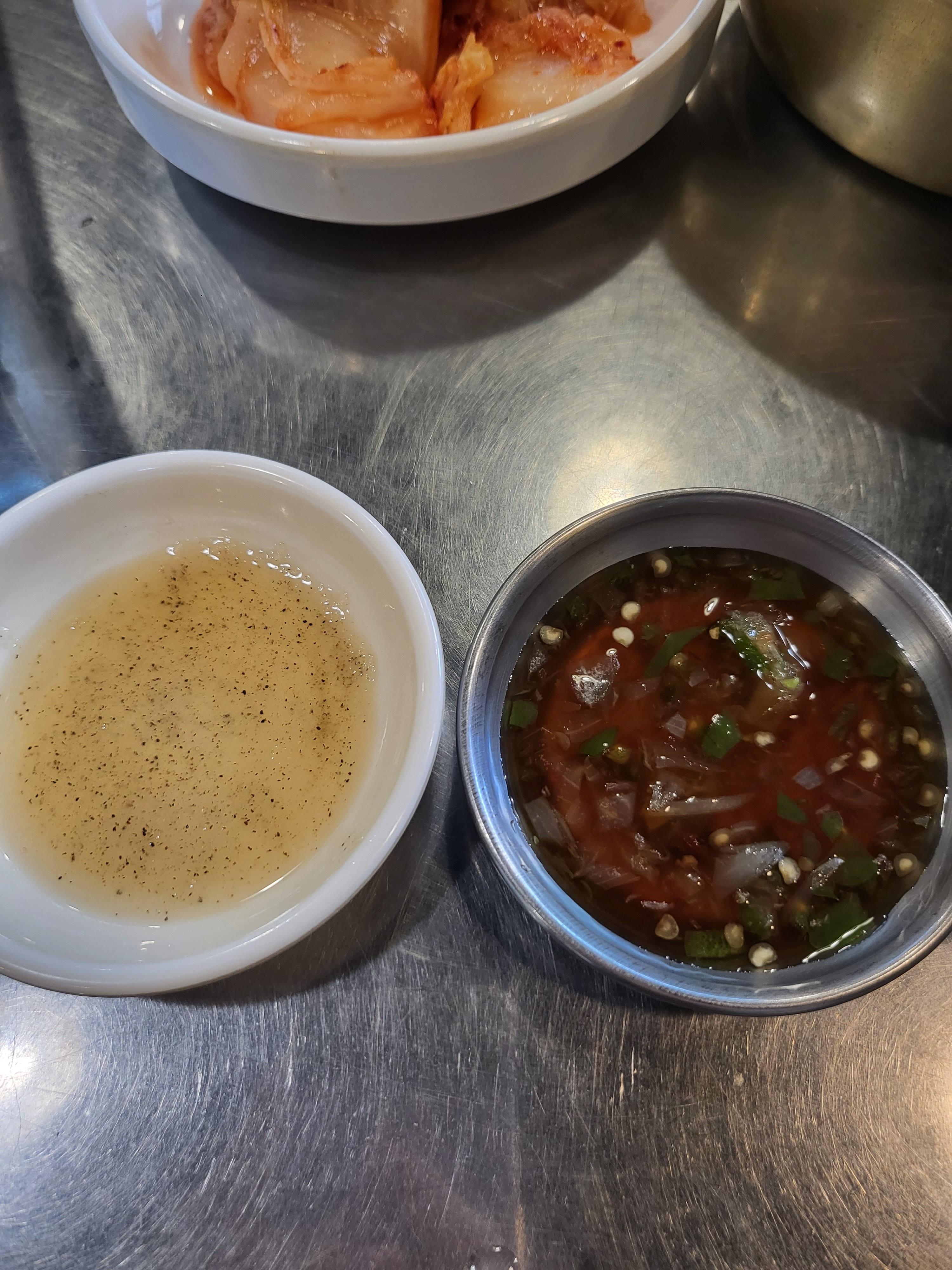 그 외에 기본 찬들은 비슷해요. 맑은 콩나물국, 콩나물, 김치, 깻잎 등등 있고요. 나머지 기름장과 간장 양념장은 각 각 준비해주십니다. (기본 찬들은 무한 리필 가능)