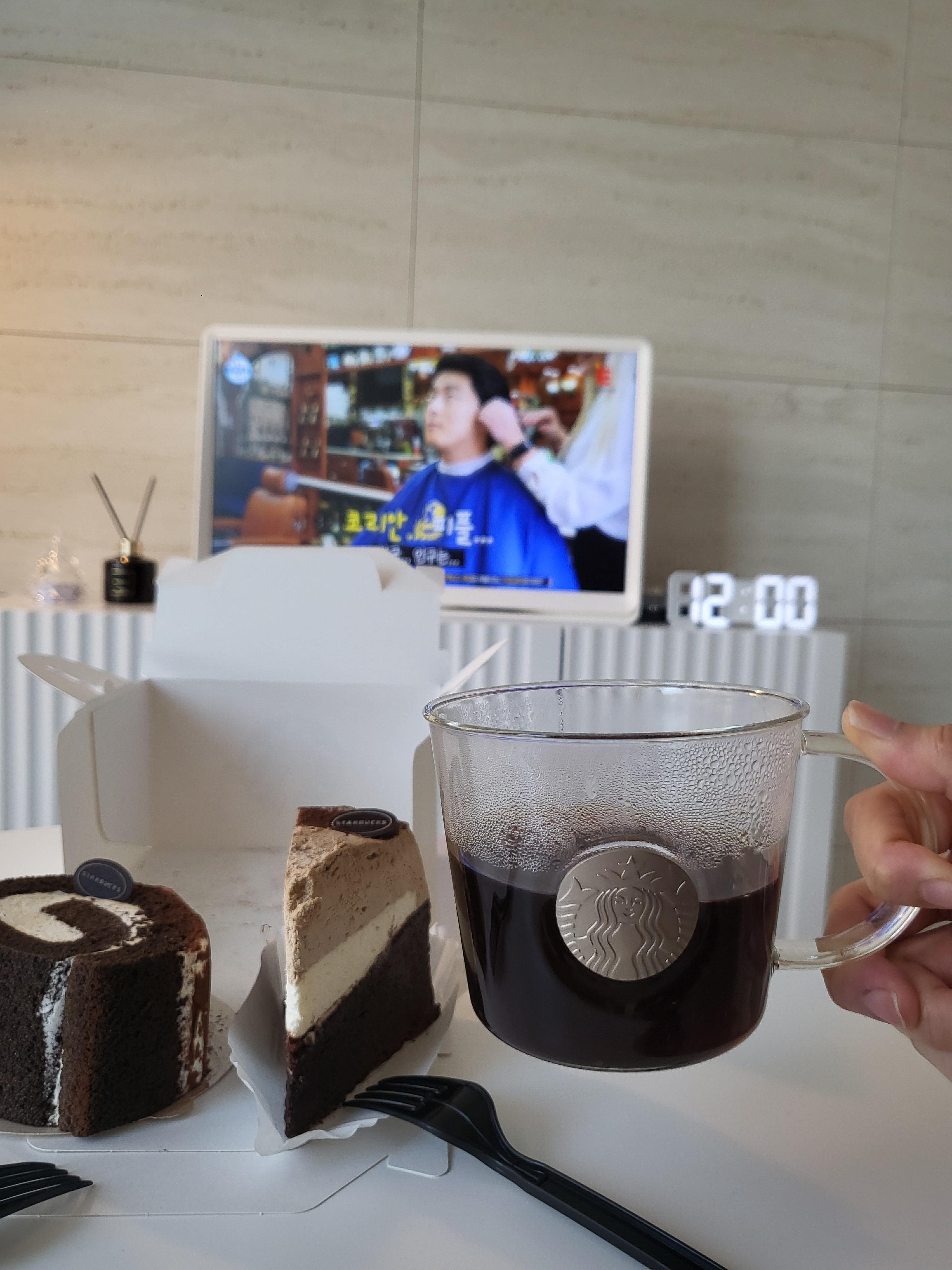아침은 친구와 자취방 근처에서 순댓국 맛있게 먹고 들어와서 제가 선물로 들고갔던 스타벅스 유리컵에 커피도 마시고 케이크와 함께 후식으로 먹었네요.